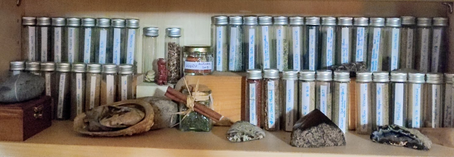 Depuis plusieurs années, je recueille des terres venues de contrées proches et lointaines : Grèce, Canada, Québec, Sicile, Mali, Irlande, Autriche, Finlande, Italie, Vietnam, Sibérie, Nouvelle-Zélande, désert de Gobi, île de la Réunion, Hawaï, Australie, Mongolie, Malte, Guatemala, et bien d'autres.